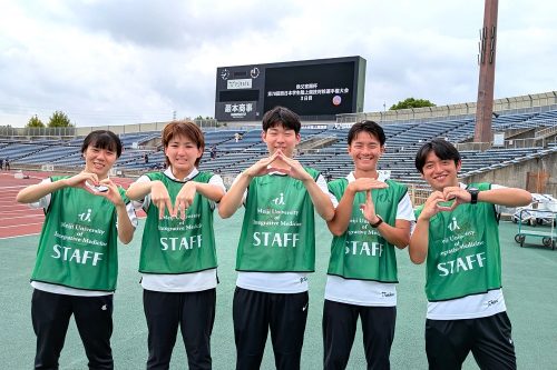 本学ならではの特長として、学内にアスリートサポートセンター(ASC)を中核とした医療ネットワークを有すること、全国を舞台に活躍する強化指定クラブを有する点が挙げられます。こうした利点を積極的に活用し、豊富な実習でアスレチックトレーナーに必要な実践力を磨くことに加え、従来のようなケガをした方々(選手に限らず子供から高齢者まで)への対応だけでなく、ケガをさせないようコーチング(予防・指導)できる先進的で幅広い対応力を育てることを大切に取り組んでいます。強化指定クラブに学生トレーナー(MAT生)を配置し、日頃から選手のサポートに務めるなど互いに支え合いながら、競技成績の向上はもちろん、トレーナーとしての対応力アップに努めています。