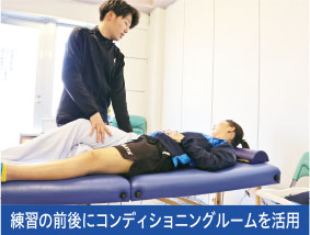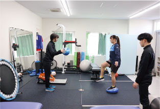 本学ならではの特長として、学内にアスリートサポートセンター(ASC)を中核とした医療ネットワークを有すること、女子柔道部や女子サッカー部、陸上競技部など全国を舞台に活躍する強化指定クラブを有する点が挙げられます。そうした利点を活かしASCやメディカルアスレチックトレーナー育成プログラム(MAT)での活動をはじめとした豊富な実習で実践力を磨くことに加え、従来のようなケガをした方々(選手に限らず子供から高齢者まで)への対応だけでなく、ケガをさせないようコーチング(予防・指導)できる先進的な対応力を育てることを大切に取り組んでいます。また、各クラブに学生トレーナーを配置。日頃から選手のサポートに務めるなど互いに支え合い協力しながら、競技成績の向上はもちろん、トレーナーとしての対応力アップに努めています。