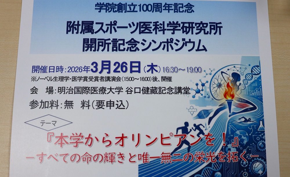 3月26日(木)、明治国際医療大学谷口健藏記念講堂において学院創立100周年記念『附属スポーツ医科学研究所開所記念シンポジウム』を開催します。シンポジウムでは、「本学からオリンピックを!」~すべての命の輝きと唯一無二の栄光を拓く~をテーマに、附属病院長の基調講演のほか、先日のUNIVAS AWARDS 2025-26の安全安心環境構築優秀取組部門で最優秀賞に輝いたアスリートサポートセンター長をはじめ関係各部署の長によるパネルディスカッションなどを実施。女子柔道、女子サッカー、陸上競技をはじめ全国で活躍する強化指定クラブからオリンピアンを目指す取り組みについて議論を深めます。参加は無料。申し込み制となっており、下記チラシのQRコードを読み取りお申込みください。たくさんの方々のご参加を心よりお待ちしております。