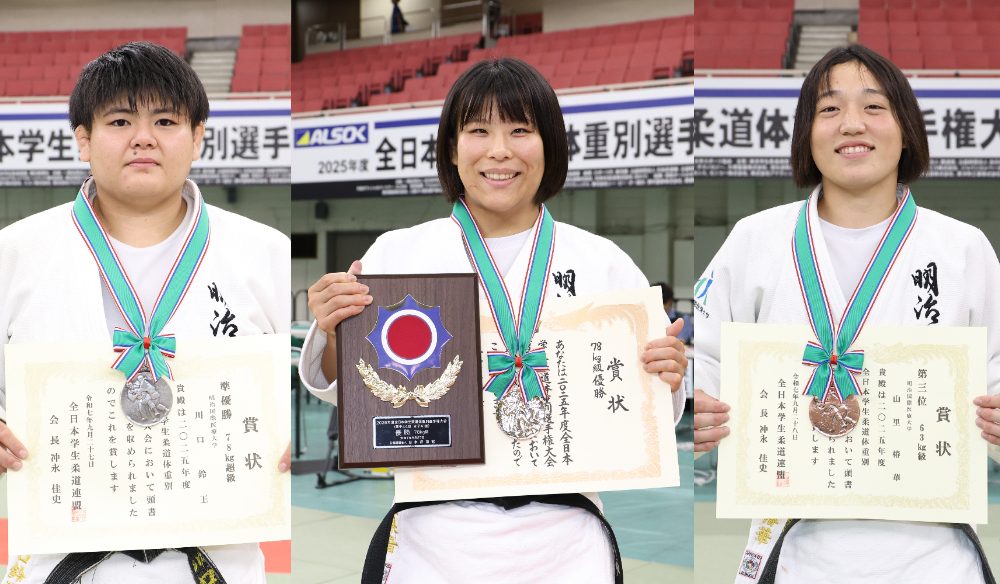 9月27・28日(土日)の2日間、2025年度全日本学生柔道体重別選手権大会(男子44回、女子41回)が東京の日本武道館を舞台に開催され、本学女子柔道部から各階級に過去最多となる11選手が出場。女子78㎏級で井上果音選手(柔道整復学科4年)が東海大学や山梨学院大学の強豪を下し初優勝。この大会でのタイトル獲得は本学初の快挙となりました。さらに78㎏超級でも前回3位の川口鈴王選手(柔道整復学科4年)が準優勝、63㎏級で山里椿華選手(救急救命学科2年)が先日の日本ジュニアに続く3位と健闘するなど3選手がメダルを獲得。6月の5人制団体の準優勝に続く活躍で全国に“明国”ありを示しました。今回の結果、11月に行われる講道館杯全日本柔道体重別選手権大会の出場権を新たに髙野選手が獲得。これですでに権利を持つ畑山、山本、竹原、髙木水月(救急救命学科4年)、山里、井上、川口選手と最多8選手が駒を進めることになります。全国初制覇を目指す10月の7人制団体戦と共に活躍が期待されます。引き続き応援よろしくお願いします。