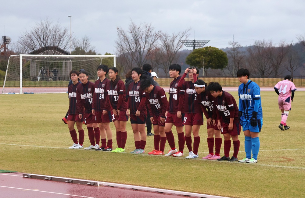 12月21日(日)、2025年度関西女子サッカーリーグの1・2部入れ替え戦が兵庫県の三木防災第二陸上競技場で行われ、今季からリーグに参入し2部2位の本学女子サッカー部が、1部7位のSASAYURI FC SHIGAと対戦。雨が降るあいにくのコンディションとなったものの、序盤から押し気味にゲームを進めると前半の11分に木虎小菜美(鍼灸学科2年)がゴールを奪い先制。前半終了間際にも新原由菜(鍼灸学科1年)が決め2-0で前半を折り返します。後半も、インカレを2日後に控えた梶山朋恵主将(柔道整復学科4年)などを投入。2点を追加し4-0で快勝。参入1年目で1部昇格を果たし、インカレでの上位進出に弾みを付けました。